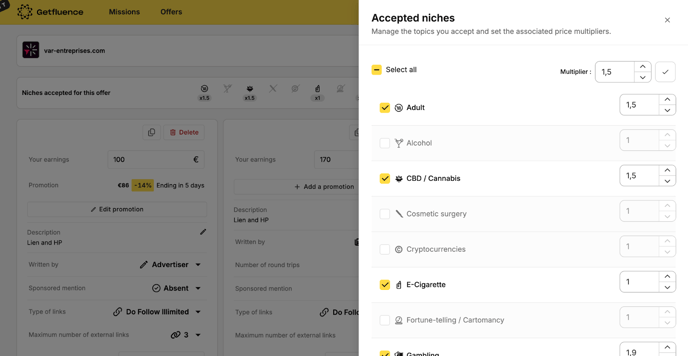As a publisher, you can now set custom multipliers for each niche topic directly in your Offer section. These multipliers allow you to adjust your base article price for campaigns related to sensitive topics.